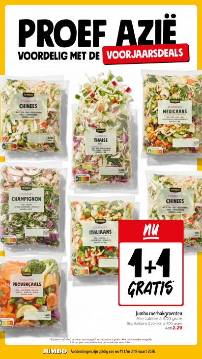 Deze tekst wordt automatisch gegenereerd, dus deze kan fouten bevatten.00 PROEF VOORDELIG MET DE A LUC TE re ge AD ST 3 eN À 7 x Tha Ë" BN A ®: m? De $ ROERBAK MIX Se ss Run kr = > Kb TRF P ROERBAKMIX » WITTE KOOL » PREI «RODE PAPRIKA CHINEES { TAUGÉ 2 SPERZIEBONEN 2 | « MEXICAANS WOKKEN: 4-6 MIN. Fi ze) = RODE PAPRIKA ® RODE KIDNEYBONEN = WITTE KOOL « PREI = MAT 8 7 — = ei RL AR A F 8 oe = IN L Ft JV JERt RG << I «_ NUTRI-ScoRE y. A ook THAISE he ws 400% STIJL GRAM . WITTE KOOL = GROENE PAPRIKA » PREI ® RODE UI + RODE PEPER À } De WOKKEN: 4-6 MIN, Pl ur Zu u " 1400 AE v NUTRI-SCORE 41 pr ee € m) Am wlan - fra FP > Kd ED N A ROERBAKMIX U CHAMPIGNON Fu be à CHINEES KASTAN] EUER RE WORKEN: 44 ii ir yr WITTEKOOL „PREI RODE PAPRIKA x % ) AK ee fi „TAUGÉ «SPERZIEBONEN KEN: I \ 7 a CS 8 LI 8 EAS a Di, > ei À Do Li 40077. : à RME ITALIAANS nu PAREEIK. 5 wasco ‘ UP | RODE PAPRIKA « COURGETTE PREI = WORTEL « UI { ar LS 2, - Eu 4-6 MIN. = ® #1 P RE os a '& w D Nee bee VA D, HMBO LC nt PROVENGAALS | PEEN « RODE PAPRIKA » GELE PEEN * BROCCOLI « COURGETTE » RODE UI Fe SM WOKKEN: 6- GRATIS ro Es 400 Jumbo roerbakgroenten ORE GRAM E Alle zakken à 400 gram Bijv. Italiaans 2 zakken à 400 gram eel ee 4582.29 *Bij aanschaf van 1 product ontvang je 1 extra product gratis. Alle combinaties mogelijk. Let op: per combinatie kan de totaalprijs verschillen. J11yJ_3 D Aanbiedingen zijn geldig van wo 11 t/m di 17 maart 2026