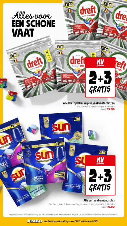 Deze tekst wordt automatisch gegenereerd, dus deze kan fouten bevatten.ed ww & © NE PLATINUM Aller voor HE q PLATINUM EEN SCHONE + @ SES 2° À u a = a ed al 9 LS Ean Ea) F ns) € Ve, ONE 19 ? o so of CAPSULES pre, ROER A u ; PLATINUM + num Ab Par 4 Ih À à ie = mann A Sa N [4 +3 té 1 4 is E U GRATIS à Alle Dreft platinum plus vaatwastabletten Bijv. Lemon 5 verpakkingen à 19 stuks 69-95 ‘ © Œ ER „seg Fes a BRILLIANT SHINE PLUS STAM ZN PT Big ENZ >= Ki nass Yet En A NEW EXCEPTIONAL CLEANING pt M 16 RR SUN ee TOR er NS CSA a Y a has) É EN) Er N”, dl on sin SN RT BRILLIANT d Dr EexTR EE FERN BRILLIANE WITH SHI ACTIVE ACTION N ee N+ TE er RTL TA Los ce Er Be CLEANING > ANNE ‘ +3 REM To ES 100% € de CES STAINS T&eco PROGRAMS AS 7 = / € RATIS N (4 Co EA > xo Alle Sun vaatwascapsules Bijv. Sun briljant shine vaatwascapsules 5 verpakkingen a 16 stuks 49-95 *Bij aanschaf van 2 producten ontvang je 3 extra producten gratis. Alle combinaties mogelijk. Let op: per combinatie kan de totaalprijs verschillen. BUMB 3 D) Aanbiedingen zijn geldig van wo 18 t/m di 24 maart 2026