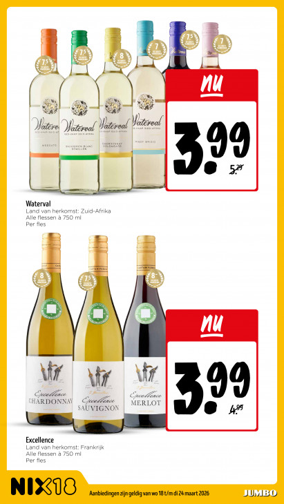 Deze tekst wordt automatisch gegenereerd, dus deze kan fouten bevatten.e= LE |! DE ZA | Le Wa EE a Ve ésoal SUID-AFRIK AF HARDONNAY NOT GRIGIO MO VIGNON BLAN SEMILLON OLOMBARD | zt > 2# EEE — m Waterval Land van herkomst: Zuid-Afrika Alle flessen a 750 ml Per fles le Ze 2 CAST TAN FAM STAN FAMILY (GTS È _ zE VOO dk nu mr ir ir Ar Crcotience on CH ÂRDONN, A\ er MERLOT SAUVIGNON ® +” N £ hi Excellence Land van herkomst: Frankrijk Alle flessen a 750 ml Per fles N Î > 6 Aanbiedingen zijn geldig van wo 18 t/m di 24 maart 2026 JU 150