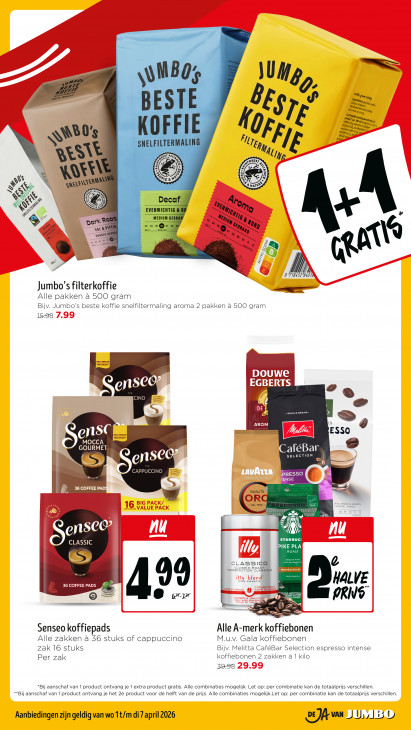 Deze tekst wordt automatisch gegenereerd, dus deze kan fouten bevatten.een | ar 8 1 un I JU ED. : em, Pair Rs 7 ES dels mer, Alin, Bil Ke “lens, 00, none PA fen, een, 0 SBO | Fr Am IE tS\ KOREN l m, 6 4 85 tt dl PIE ): 3 guten! { einde À St NS Sy ESS N B 5 Deca g à ro EVENWICHTI le, MEDIU % Weg 7 Arys Ke park Rt os 0 05 © Hap y Un MILD REGULAR. Prod 07 Un RER % an, & art ” HIN Jumbo’s filterkoffie ES Alle pakken à 500 gram Bijv. Jumbo's beste koffie snelfiltermaling aroma 2 pakken à 5OO gram 15-98 NEU/NIEUW fl (ai u RTS + WHOLE BEANS + < AROM EN SC = ESSO 22 MOCCA aféBar SELECTION ensce >” | B) LS, CAPPUCCINO LAU ESSO d U SE S SS Ban 36 COFFEE PAD QUALITÀ ORC — DAL 1956 — 2e — © vn Krach, ense Q STARBUC CLASSIC PIKE PL ROAST & CLASSICO x SORREFASTION SL ASalgle | 00% ARABICA 99 HALVE + 3 36 COFFEE PADS © Hue 6 67-17 PRINS N N Pp) 2 A Senseo koffiepads Alle A-merk koffiebonen M.u.v. Gala koffiebonen Alle zakken à 56 stuks of cappuccino zak 16 stuks Bijv. Melitta CaféBar Selection espresso intens koffiebonen 2 zakken à 1 kilo Per zak 39-98 *Bij aanschaf van 1 product ontvang je 1 extra product gratis. Alle combinaties mogelijk. Let op: per combinatie kan de totaalprijs verschillen. **Bij aanschaf van 1 product ontvang je het 2e product voor de helft van de prijs. Alle combinaties mogelijk.Let op: per combinatie kan de totaalprijs verschillen. Aanbiedingen zijn geldig van wo 1t/m di 7 april 2026 DE)A van | U,/ 1550