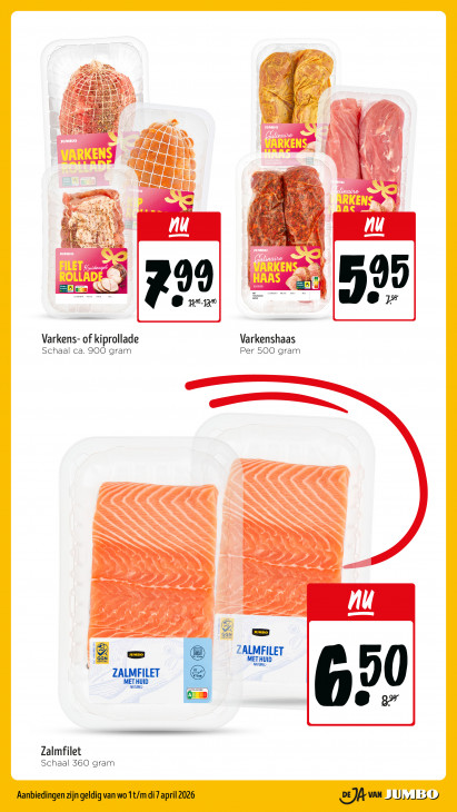 Deze tekst wordt automatisch gegenereerd, dus deze kan fouten bevatten.RE IR En =, es SS JR 72 ZA af © À ù F 5 te JUMBO < FAR N pi JUMBO & EN ARKEN Ad VNL GN Aa “a BE RL Lil Dy Bg _ ® En ma a A RKEN nu ul Pr JUMBO nn ARKE ROLLAD 95 ® 6 7: nn Varkens- of kiprollade Varkenshaas Schaal ca. 900 gram Per 500 gram GG N = GG, ax —— = < SS == ee == N = ESS > à À | u \ WKN 2 RS 2 >> u # ) 5 = > # nr el ALI 4 ji A > j Ù 6 Sd à re ef 1e © nt ee Pr, GEN.ORG GGN ES © FILET GGN > AM -NATUREL- UID PAQUET = NATUREL- NUTRISCORE 0: æ ? Zalmfilet Schaal 360 gram Aanbiedingen zijn geldig van wo 1t/m di 7 april 2026 DE)A van | U,/ 1550