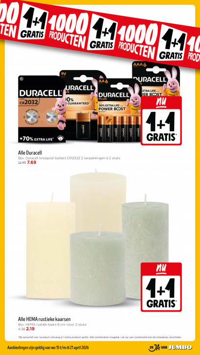 Deze tekst wordt automatisch gegenereerd, dus deze kan fouten bevatten.| [N 0 0 AT | KU TEN RO, EN } NV LAN ® LÉ O RE ‘4 m o RACELL \ Fe DURACELLE = Ip) XT LIFE m IS pac + CODE: ©, Z end % cr203 p: = a 2% E GUARANTEED" = % 150% EXTRA LIFE‘ ZN — Le nu | POWER BCOST = Ill 5 CELL Re pl u, ( \ | Em sin = nn à be M à — — EE É + 27 rater rer Le. we | SE £i à m pesspassaus,| Dr Se + 1133vand | T1a2vana 11IDVUNG T112vuNna 1132VNQ T1a2vana T1a2vana peer} N +70% EXTRA LIFE" ® GRATIS Alle Duracell Bijv. Duracell knoopcel batterij CR2032 2 verpakkingen a 2 stuks 1528 7.69 nu + | GRATIS Alle HEMA rustieke kaarsen Bijv. HEMA rustiek kaars 8 cm ivoor 2 stuks 438 2.19 “Bij aanschaf van 1 product ontvang je 1 extra product gratis. Alle combinaties mogelijk. Let op: per combinatie kan de totaalprijs verschillen. Aanbiedingen zijn geldig van wo 15 t/m di 21 april 2026 1 | U, 130
