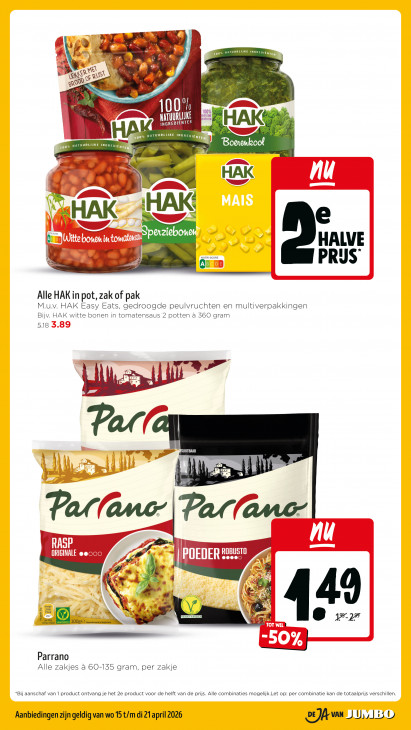 Deze tekst wordt automatisch gegenereerd, dus deze kan fouten bevatten.2 en PA ) OTE TEE TTS En er Le > ER aus S RR wi en an zn. AT IREDIENTEN URLURE ra RHAK Do NATUURLIIKE INGREDIEN rn LE = Bee —n 7 AL] oft k is «HAK AK \ AA x u” Oe APEN Rn re HALVE NUTRI-SCORE = de er A O2 CB PRIS Alle HAK in pot, zak of pak M.u.v. HAK Easy Eats, gedroogde peulvruchten en multiverpakkingen Bijv. HAK witte bonen in tomatensaus 2 potten à 560 gram 518 3.89 —— al u, a Tag | ws mer ns Ca 4 ALL Dar fanc Parfamo ng a ORIGINALE eeooo me ROBUSTO | POEDER eee = ed ei 7% 49 295 ed Im NE « À de D ms 6 :: @ 100 TOT WEL LUZ Parrano Alle zakjes à 60-135 gram, per zak Bij aanschaf van 1 product ontvang je het 2e product voor de helft van de prijs. Alle combinaties mogelijk.Let op: per combinatie kan de totaalprijs verschillen Aanbiedingen zijn geldig van wo 15 t/m di 21 april 2026 A VAN) U, |