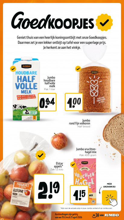 Deze tekst wordt automatisch gegenereerd, dus deze kan fouten bevatten.Goedxoopsrs © Geniet thuis van een heerlijk koningsontbijt met onze Goedkoopjes. Daarmee zet je een lekker ontbijt op tafel voor een superlage prijs. Je herkent ze aan het vinkje. Up > = een v HOUDBARE ader Jumbo 7% HALF Oudpare halfvolle me 4% Bez“ VOLLE Pak 1 liter mk MELK de 00 04 LA Nt PA EN —— CEE bevat glas 1383 EL Les Ku / 6 kcal 5% umbo PL rond fijn volkoren Half brood 4 A 2 f art ' it SR N À À N £ Jumbo vruchten- N agel mix Pak 400 gram Elstar v es appels* Zak 1,5 kilo ROL MEER GOEDKOOPJES ELSTAR ea (9 Klas: df X 15x10 hd Max: 65.75 N 45: ns a *Kijk voor de actuele prijs in jouw Jumbo winkel of op Jumbo.com De Aanbiedingen zijn geldig van wo 15 t/m di 21april 2026 1 JUMBO
