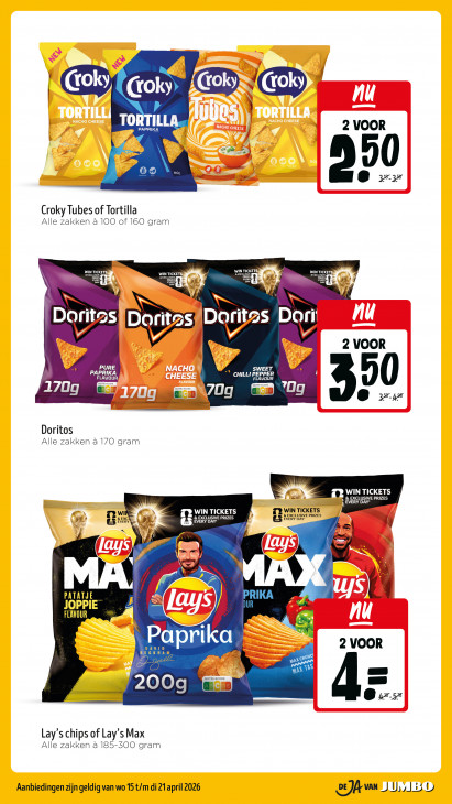 Deze tekst wordt automatisch gegenereerd, dus deze kan fouten bevatten.Cok) (roky CD (CD TORTILLA PAPRIKA 2 VOOR das 9 © v0 d ® ze: Croky Tubes of Tortilla Alle zakken à 100 of 160 gram WIN TICKET: DES en he WIN TICKET: a8 LA: ESS Orit ES 0 2 VOOR w PAPRIKA OO NT GE Hr mp il NUTRI-SCORE NUTRI-SCORE = v0 h 70g Dg (ns) ® :,= Doritos Alle zakken a 170 gram Fe WIN TICKETS == —— , EVERY DAY' & ed PRIZES re A WIN TICKETS 52 WIN TICKETS ze [AS & EXCI EVERY à 137 EX CRUE PRIZES ee PRIZES ij = Y Vz PATATJE D 4 | FLAYOUR à Paprika een AM 2 VOOR TZ a NIN Br na AT v 200g # 6: Lay's chips of Lay's Max Alle zakken a 185-500 gram Aanbiedingen zijn geldig van wo 15 t/m di 21 april 2026 1 | U, 130