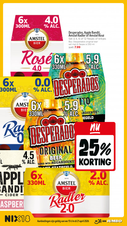 Deze tekst wordt automatisch gegenereerd, dus deze kan fouten bevatten.SS Desperados, Apple Bandit, Amstel Radler of Amstel Rose AMSTEL Set à 4, 6 of 12 flesjes of blikjes Bijv. Desperados original bier set met 6 flesjes a 550 ml ww GX A 5 d; SAUL UE 0 Ë EE N &, ) en A Hl A ij 6x 0.0 H B 300ML % ALC. F I E Ë I EL au FR, EC HD 1870 gr S Ê ei ee \RDIE Eh à 2 4% EGELD & de © W Taste } LA El A Ex E I | E À (IT = i Ft A H il au al Ü Il 8 NAL N (95% 4. SON 1:74 AR % À UAR DIE RSS COPA LC. oüReD Wirt À KORTING 5 1870 IPPL AMSTEL | ANDI = CIDER NIX Aanbiedingen zijn geldig van wo 15 t/m di 21 april 2026 1 | U, 130