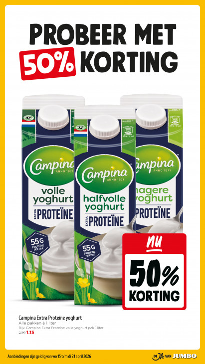 Deze tekst wordt automatisch gegenereerd, dus deze kan fouten bevatten.PROBEER MET eyÀ KORTING 185 [— iq gi Du I N ei ANNO Al ANNO DU NN volle yoghurt halfvolle yoghurt PROTEINE PROTEINE PROTEINE Le > I prOTEINE Aan AL] ERPAK ON ed A In I} > ll 0% \ | KORTING Campina Extra Proteine yoghurt Alle pakken a 1 liter Bijv. Campina Extra Proteïne volle yoghurt pak 1 liter 229 1.15 Aanbiedingen zijn geldig van wo 15 t/m di 21 april 2026 DE) van | U,/ 1550