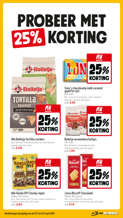 Deze tekst wordt automatisch gegenereerd, dus deze kan fouten bevatten.PROBEER MET ELYA KORTING nu Bolletje’ p 52 M EN EN HD Ze Du )CQ KORTING ONSS CHOC Le Tony’s chocolonely melk caramel SINDS NJ 1867 Bolletjes gepofte rijst Pt Per pak [N Bijv. Tony’s chocolonely melk caramel u gepofte rijst pak 180 gram 4 469 3.52 van I On A | À nu nu agree 27 So Bol te! PENN erw el AMEN (28777; 8 AU DEN BESCHUITIES 4 kchocoladı AV Do, 4 N 59, © @ VEZELS DIRAVEL GIG, aa { KORTING mar ar} KORTING mr Alle Bolletje Tortilla crackers Bolletje verwenbeschuitjes Bijv. Bolletje Tortilla crackers sea salt & black Per pak pepper zak 150 gram Bijv. Bolletje verwenbeschuitjes 279 2.09 melkchocolade pak 100 gram 259 1.94 PLANT CET > sc AND Biscoff HANDS wit-blanc hocolade m (®F chocolade - chocolat LA HU AR VN - 6 A Bd 5% @ Do, N KORTING LES sl KORTING The Original Speculoos aan Alle Hands Off Chunky repen Lotus Biscoff Chocolade Reep 100 gram Reep 180 gram Bijv. Alle Hands Off Chunky cookie caramel & Bijv. Lotus Biscoff speculoos banana chips reep 100 gram chocoladereep wit crème pak 180 gram 349 2.62 449 3.14 Aanbiedingen zijn geldig van wo 15 t/m di 21 april 2026 DE) van | U,/ 1550