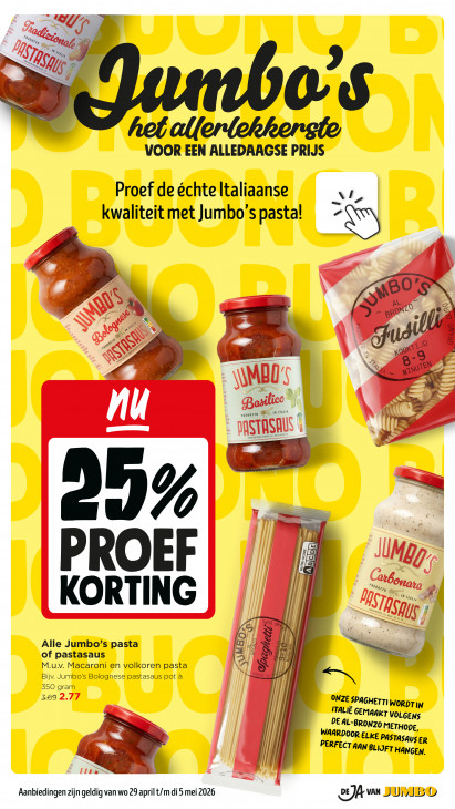 Deze tekst wordt automatisch gegenereerd, dus deze kan fouten bevatten.U7 M gp B os erlekkenste VOOR EEN ALLEDAAGSE PRIJS Proef de échte Italiaanse kwaliteit met Jumbo 's pasta! “ Pr L/ 05 AN 3) N 44 — prV eN : art + 24 wad TEN \AMBU Basilieo 4! id MA Cd AL am 3 DASTASALS I : ve 4 N IM | Pi Mg Fe Cana N ù Alle Jumbo’s pasta of pastasaus M.u.v. Macaroni en volkoren pasta Bijv. Jumbo’s Bolognese pastasaus pot à 5 350 gram / ONZE SPAGHETTI WORDT IN ITALIË GEMAAKT VOLGENS DE AL-BRONzo METHODE, WAARDOOR ELKE PASTASAUS ER PERFECT AAN BLIJFT HANGEN. u # u JUMBO