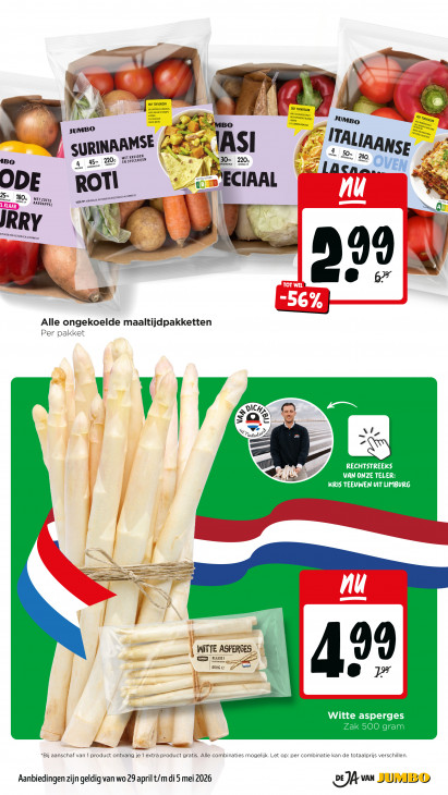 Deze tekst wordt automatisch gegenereerd, dus deze kan fouten bevatten.me” pmen #. MM ya ZELF TOEVOEGEN S —B soon ZEIF TOEVOEGEN \ AROTLVERLEN (OF WRAPS) 200 SLEHVERWESIR ST 2e PDU HU = = SMON JUmBo fog, Zur TOfvosoey BO Or: tea, ia JumBO nn VOLE SI Mau ee mr; ANSE 5e 220: Meteen 4 D 30 REDINGSTD. | GAOENIERR 220: Bory 50. 240. À ras a, & paas N EN À A = ECIAAL ODE ROTI 25 AL] ENGS UT. TE Rp. 180, MET ZOETE veGhTIP: gg DEK DOOREN gGerARISCh ALVERNA NUTRI. AARDAPPEL 0 IRRY \ N NP DOOR EEN vegeraaiscn ALTERNATIEF A 6 TOT WEL 56% Alle ongekoelde maaltijdpakketten Per pakket 5D ICH; © - eV YA m D € RECHTSTREEKS 4 ) à. VAN ONZE TELER KRIS TEEUWEN UIT LIMBURG SE | N EN [= zie ee P e WITTE ASPERGES nn — N | 1 a Tr — ne Z F7 daa ee | LL a Witte asperges Zak 5OO gram LH *Bij aanschaf van 1 product ontvang je 1 extra product gratis. Alle combinaties mogelijk. Let op: per combinatie kan de totaalprijs verschillen Aanbiedingen zijn geldig van wo 29 april t/m di 5 mei 2026 2A vAN JUNIBOD