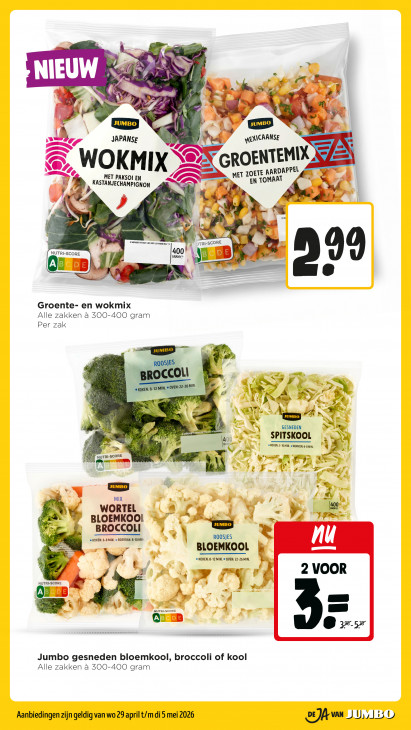 Deze tekst wordt automatisch gegenereerd, dus deze kan fouten bevatten.NS “ NIEUW = 7 A 4 Á pe à. € a Bee 0) 4: hi 5 = + An Là À mi Ve JAPANSE ñ WEXICAANSE EN N WOK MIX © G ROENTEMIX, MET PAKSOI EN MET ZOETE A ARDAPPEL STREAM PGON Cn] EN TOM AAT RS A > LL EP PA 7 En BR F 2 JTRI-SCORE NUTRI-SCORE Me 99 HORROR Test wt ancaman oz De LÉ Ed 22 A an Groente- en wokmix Alle zakken a 300-400 gram Per zak m AN et, VZ 9 ui a 2 Sy << 5 2 € Ee am, 4 AE a NE GESNEDEN >) nd EN u % à) SPITSKOOL \ N 400 GRAM, KOKEN: 5-10 MIN. e WOKKEN: 6. B MIN. à ER N „ES x ) RI-SCORE “mt FA 4 | Lr 4 AE +. re = | 1 MIX WORTEL u à ed -% Tea BLOEMKOO! Le! BROCCOLI = KOKEN: 6-8 MIN. e ROERBAK: 8-10 MI! Lel ROOSJES ub BLOEMKOOL Wi KOKEN: 8-12 MIN. © OVEN: 22-26 MIN. 2 VOOR “ NUTRI-SCORE uf wi 71 D CB À. 24 ih A} 5 NUTRI-SCORE aten ® 2-5 Jumbo gesneden bloemkool, broccoli of kool Alle zakken à 500-400 gram Aanbiedingen zijn geldig van wo 29 april t/m di 5 mei 2026 2A VAN _) U, |