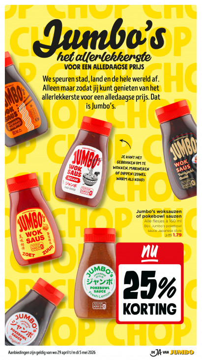 Deze tekst wordt automatisch gegenereerd, dus deze kan fouten bevatten.os het allerlekkerste VOOR EEN ALLEDAAGSE PRIJS We speuren stad, land en de hele wereld af. AN) N Alleen maar zodat jijkunt genieten van het allerlekkerste voor een alledaagse prijs. Dat bs \Ÿ Wr is Jumbo’s. ® 39 sog BE se St \ JE KUNT HET GEBRUIKEN OM TE le 4 WOKKEN, MARINEREN VS El ET / II > OF DIPPEN (ZOWEL SC Nos RC De Se" S A WARM ALS koup) en —< wg 48. 0052 Jumbo’s woksauzen of pokebowl sauzen Alle flesjes à 160 ml Bijv. Jumbo's pokebowl sauce Japanese style x MS i 6 O 6 a 2 OT zi | s A SAUCE "osh Lem? 129% P 4 KORTING / ke Aanbiedingen zijn geldig van wo 29 april t/m di 5 mei 2026 2E)A vn JUMBO