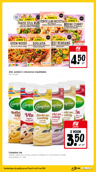 Deze tekst wordt automatisch gegenereerd, dus deze kan fouten bevatten.f 2? Æ er: JUMBO’ s N Or. Sd JUMBU'S N JUMBO’ 5. à © THAISE STIJL RIJ g; TORTELLINI RICOTTA ROMIGE TOMATENSAUS EN KAAS RRY KNOFLOOK-ZWARTE PEPERSAUS ET KIP. SPERZIEBONEN EN ITALIAANSE KEUKEN > MAGNEIBON - VERS INGEVROREN Ya, ET JASMIJNRIJST, GARNALEN AZIATISCHE KEUKEN - MAGNETRON - VERS INGEVRO RE CHE KEUKEN - MAGNETRON - VERS INGEVROREN EN SPERZIEBONEN prs ej TT vie en Ne KN: L è 5 © et UMBO'S w ins, © JUMBO'S ı NW! MILD PITTIG JEEFR DANE P>} UDON NOODI VERVLIESRLUST. RUNDVLEES. DADGELE pu EN HOSTERSE GOULASH 800 WATT: 9-10 MIN AZIATISCHE KEUKEN - MAGNETRON - VERS INTERNATIONALE KEUKEN - MAGNETRON - VERS INGEVROREN MET KIP EN ZWARTE BONEN MET ZIL PAPRIKA EN WORTEL ISCHE KEUKEN - MAGNETRON - VERS INGE nu Na >< st it ‘4 Á K- wei. a À Kn DUT v0 rt 800 WAT 800 WATT: 9-10 MIN. 800 WATT: 9-1 6 :- „LOB (CB in 4 Alle Jumbo’s vriesverse maaltijden Per schaal LLLLLL LIE, LS Unk mm | — 0 2 per 100m: = à ANNO 1871 ANNO 1871 (amp ANNO ANNO 1871 n a Zacht en N smaak Va nen vanille smaa rum sn uchtig Fr anaan maak rozijnen vanille smaak smaa FF NEE VOLLE AL] SMAAK SMAAK VOL == Nen | a \ a, LUCHTI LEKKER an = Æ » 2 VOOR I N DO rn ® 15x Campina vla Vlaflip, Zacht & Luchtig, oranje, bolletjes of rumrozijnen smaak Alle pakken à 1 liter Aanbiedingen zijn geldig van wo 29 april t/m di 5 mei 2026 1 UMBO