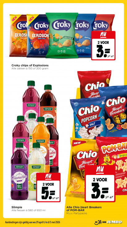 Deze tekst wordt automatisch gegenereerd, dus deze kan fouten bevatten.= = — roky oky t Groky { (toky 14 A , = BOLOGNE sp > PAPRTk CE > = 4 2 VOOR 200 2006e | EN Go ss ooo fm ® zr Croky chips of Explosions Alle zakken a 150 of 200 gram LL c à | Stimpie | [Ce M a c Eg f Le uv af L 14% — L re tt ra =, ALL CUT) 1 SAL PELL = DER Ey 5 f Po of nack ep 4 À ple A NEW LR == \ Ke À - U / ZL "y ET © \ U Y er ) € © 2] ri Qrigina D Kl, f d Al {Val 2. A N 4 ALLER Heu, „ah 0, 7 pale PB N sırooP 2 VOOR 2 VOOR ui Sa Sega 7 L am ® zee OO: Slimpie Alle Chio Heart Breakers Alle flessen à 580 of 650 ml of POM-BAR M.u.v. Partypacks Aanbiedingen zijn geldig van wo 29 april t/m di 5 mei 2026 1 UMBO