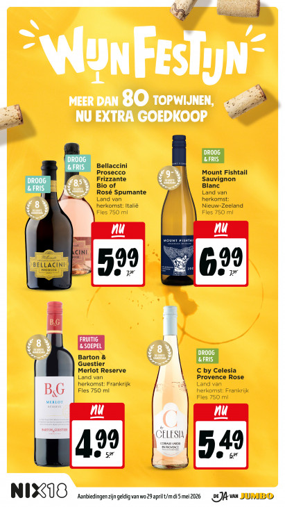Deze tekst wordt automatisch gegenereerd, dus deze kan fouten bevatten.à hf À ré 7 # wer er a £ - 27 LR : DROOG UNT FISHT Bellaccini & FRIS Prosecco Mount Fishtail DROOG Frizzante Sauvignon Bio of Blanc À Rosé Spumante Land van & u Land van herkomst: herkomst: Italië Nieuw-Zeeland Fles 750 ml Fles 750 ml nu ul WOU SLE N SEN FRIZZANTE EXTRA DAY N7 BELLACI 99 CA ROSECCO 202 4 | 6 ; (fl Il Barton & Guestier Merlot Reserve C by Celesia Land van EE — Provence Rose herkomst: Frankrijk \ = I a Land van Fles 750 ml à BG herkomst: Frankrijk Fles 750 ml MERLOT RÉSERVE nu m BA RTON EHESTEN CELESI COTEAUX VAROIS OR EROVENCE 6 57 4 N Û SS 6 Aanbiedingen zijn geldig van wo 29 aprilt/m di 5 mei 2026 ve)A vaN JUNABD