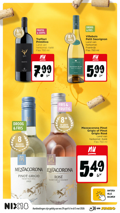 Deze tekst wordt automatisch gegenereerd, dus deze kan fouten bevatten.De ra #— Zas IE mm Villebois Trefilari Petit Sauvignon Primitivo Land van Land van herkomst herkomst: Italië Frankrijk Fles 750 ml Fles 750 ml Een nu nu ww PRIMITIVO LA EBoISs SAUVIGNON BLANC PETIT VILLEBOIS 99 FRANCE 99 6 or 8 7 Pe me Ta m * I — EL, Pr DROOG & FRIS Mezzacorona Pinot Grigio of Pinot Grigio Rosé Land van herkomst: Italië Fles 750 ml AL] MEZZACORONA F77ACORONA 49 PINOT GRIGIO ROSE 6 67 TRENTINO DOC VIGNETI DELLE DOLOMITI 2023 I ONTDEK a u + ALLE SE % EN WIJNEN ne NIX00 Aanbiedingen zijn geldig van wo 29 april t/m di 5 mei 2026 A VAN JUN