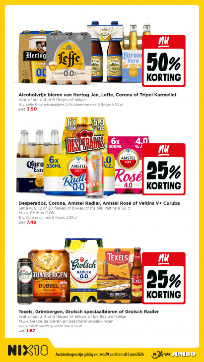 Deze tekst wordt automatisch gegenereerd, dus deze kan fouten bevatten.yd if € Cr DTA 30ce Ai LORIE = >holvrij EN EUR CT IN ni Le nu él il 4 az Hertog or 3 Moron ene Gvipe/ vipe/ ETD OL\ BitreBe Belgisch sch re ER rm rme 0% el), 0% 2 BLOND tgn RS 00 | KORTING MR a a a Alcoholvrije bieren van Hertog Jan, Leffe, Corona of Tripel Karmeliet Krat of set à 4 of 6 flesjes of blikjes Bijv. Leffe Belgisch abdijbier 0.0% blond set met 6 flesjes à 50 cl 629 3.50 nj 6 7 2 ee 2 AREW (2 LAN ITH 100% OF NATURA lili Eb Kops 300ML % zijd A RAA EN AL] Mam 12) ER AMSTE ei! L.O OML AMSTE FALC. Goro 33 BIER xtr SINCE er (4212 5% FINA MAS & 4.0 [= 0.0, KORTING — Desperados, Corona, Amstel Radler, Amstel Rosé of Veltins V+ Curuba Set ä 4, 6,12 of 20 flesjes of blikjes of los blik Veltins à 50 cl M.u.v. Corona 0.0% Bijv. Corona set met 6 flesjes à 53 cl 999 7.49 Tosen 74 TEXEIS a AH TEXELS SPECIAALBIER Al TD Giotich T Di RADLER folic KRACHTIG X and N 0.0 - ne a TE D UB Do, TET DE FRISSE SMAAK VAN CITRO TRIPEL Dt nu san | Si ud 1} 17 KORTING A Texels, Grimbergen, Grolsch speciaalbieren of Grolsch Radler Krat of set à 4 of 6 flesjes of blikjes of los fles of blik M.u.v. Gekoelde bieren en geschenkverpakkingen Bijv. Grolsch krachtig kanon blik á 50 cl 249 1.87 NIRKUG Aanbiedingen zijn geldig van wo 29 april t/m di 5 mei 2026 LE JA van UM