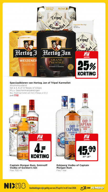 Deze tekst wordt automatisch gegenereerd, dus deze kan fouten bevatten.Deic € q AX33cl€ | A À ipe/S Le A ’ 16 79 df < Be n elgisch bier/Biere beige Alc. 8,4 | ee arm KS LS U Si B Ta Éxipe u Nl en EN leje , LE Herton J Ann ul 22 WW ZENER ROD mg TISC BITTERZ! NDIG = 6X30 25% Nn KORTING Speciaalbieren van Hertog Jan of Tripel Karmeliet Alcoholhoudend Set ä 4, 6 of 12 flesjes of blikjes M.u.v. Geschenkverpakkingen Bijv. Tripel karmeliet set met 4 flesjes à 55 cl 249 BBEAN RU PTAN A BBEAN RUN L rs Ken Wo à ‚di LE il 1 IRNOFF |‘ AR || N Zu EE D à Pr GOR APTAIN CARIBBEAN ONDON | CAPTAIN N (apfa 1 CARIBBEAN 5 Y Sp ) ul (2 1. WELL MATU AL] 5 | IGINAL, € a u \ Ge Ol IN u 599 L = 199-209 il El KORTING Captain Morgan Rum, Smirnoff Esbjaerg Vodka of Captain Vodka of Gordon’s Gin Morgan Rum Fles 700 ml Fles 1 liter N | SU 6 Aanbiedingen zijn geldig van wo 29 april t/m di 5 mei 2026 2A VAN ) 1,1130)