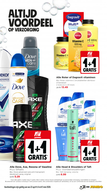 Deze tekst wordt automatisch gegenereerd, dus deze kan fouten bevatten.ALTIJD Dagravit VOORDEEL Multi+ MULTIVITAMINEN EN MINERALEN OP VERZORGING 0 TOT à C1000m Vitamine C ND 1000 mg WEERSTAND Vitamine C 70 Dove WEERSTAND MEN LZ care uni Citroensmaak kauwtablette dvanced m 4:4 — X sinaasappelsmaak bruist | GRATIS PROTECT | REFRESH | REPLENISH eXOr Alle Roter of Dagravit vitaminen ADVANCEL PROTECTION Bijv. Roter vitamine C bruistabletten abrikoos- sinaasappel 2 stuks à 2 x 20 stuks 2H IVATED" DY HEAT 26-98 Dove AXE 8 ©® heade OU (ders 7 Er SHanpoonn SULA \FRICA j Op ww = shoulde ® SHAMPOOING ANTIPELUICN ANT-ROOS SHAMPOI s ‘One ade CLASSIC shoulders TTON MARQUE ANTIPELLICULAIRE SHAMPOOINS ANTIPELLICULAIRE NT-ROGS SHAMPOO Mi FA N21 ANI-RCOS MERK ER WERELD TRUS DUR & SWEAT TEER 5 ras ERSPIRANT/ Tor Jusaua LUE opf RANSPIRANT CLINICALLY PROVE B) ral 9 | ft 5 Schwarzkopf © reads Gj TI ROOS SHAMPOO + CONDITIONER. IPOOING ANTIPELLICULAIRE + SOIN 4 5 toros ê ULTRA CLASSIC A & AFR Original - 4 D ME, | PROTECTI W v SC JELLY | ically Tested S cu nt In STYLING GEI 4:4 EE | 4+4 MHALLOVERFRESH | 0% DEODORANT BOD GRATIS GRATIS Alle Dove, Axe, Rexona of Vaseline Alle Head & Shoulders of Taft M.u.v. Giftsets M.u.v. Voordeelverpakkingen Bijv. Dove advanced care anti-transpirant Bijv. Taft hairspray volume deodorant spray original 15-98 10-58 *Voor alles geldt: 2 weken lang 1+1 gratis. Elke 2 weken vind je nieuwe aanbiedingen op persoonlijke verzorging, wasmiddelen en reinigers Bij aanschaf van 1 product ontvang je 1 extra product gratis. Alle combinaties mogelijk per aanbieding. Let op: per combinatie kan de totaalprijs verschillen Aanbiedingen zijn geldig van wo 22 april t/m di 5 mei 2026 2E)A vn JUMBO