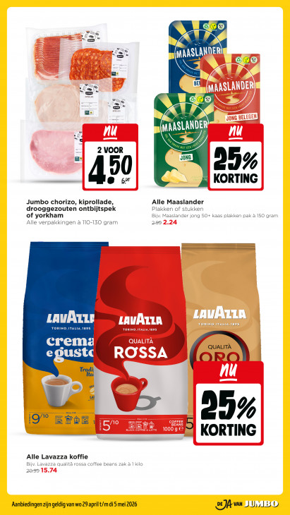 Deze tekst wordt automatisch gegenereerd, dus deze kan fouten bevatten.Dr 5 2 7e 1% MAASLAN Om Ei” WL BEI | (EL War 4 LEE fe) & MAASLANDE ne 5 5 Y 5 2 VOOR Q Lu > JONG 25% 450 ANT KORTING Jumbo chorizo, kiprollade, Alle Maaslander drooggezouten ontbijtspek Plakken of stukken of yorkham Bijv. Maaslander jong 50+ kaas plakken pak à 150 gram Alle verpakkingen a 110-150 gram 299 Re, TTT h ET Ala! TORINO, ITALIA, 1895 EN INO, IT TORINO, ITALIA,1895 Creme QUALITA egustc IDG Tradi; Ita) Se LAI IDEAL FOR ————— D 125% OT EFÉE >] KORTING Alle Lavazza koffie Bijv. Lavazza qualitä rossa coffee beans zak à 1 kilo 20-99 Aanbiedingen zijn geldig van wo 29 april t/m di 5 mei 2026 2A VAN.) l, ; | 53 0)