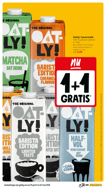 Deze tekst wordt automatisch gegenereerd, dus deze kan fouten bevatten.— 4 B En = | E ORIGINAL Oatly! havermelk 5 N Alle houdbare pakken alliter Bijv. Oatley! The original to haver barista edition 2 ; pakken à 1 liter 578 2.89 AL BARIS EDITIO CARAME FLAVOUR ally ed ee GINAL ee YIGINA GRATIS THE ORIGINAL | EE ; U8|IIY2S18A sfl1dj2810] op UE oljeUIgWOI 184 :do 387 ‘A2 Bou sarjeuiquos 81 ‘s1je16 15npoid e13xe | of BueAIUO Jonpoud | UeA Jeyosuee fig Aanbiedingen zijn geldig van wo 29 april t/m di 5 mei 2026 oh un JUMBO