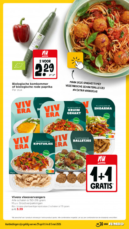 Deze tekst wordt automatisch gegenereerd, dus deze kan fouten bevatten.7 | r Vs Pa (ar C KR Ty u a) 7, Zen * 4 Jh & 16 Pt Ns Ca RE Ip D = A Fo 7 «4 "a J N B +71 \/ De 2 VOOR & 7 Er ; 29 en ® :::: veen Biologische komkommer MAAK DEZE SPAGHETTI MET of biologische rode paprika Per stuk VEGETARISCHE GEHAKTBALLETJES NU EXTRA VOORDELIG VE PLANTAARDIGE PLANTAARDIG KRUIM SHOARMA GEHAKT A 7 Be r N © N re Er + pi Mons VP \ > sl I EET sé PLANTAARDIGE B PLANTAARDIGE BALLETJES KIPSTUKJES ne PE me a "NUTRI-SCORE RL m “= re = ae Pe v 44 Ya u GRATIS Vivera vleesvervangers Alle schalen a 150-216 gram M.u.v. Grootverpakkingen Bijv. Viviera plantaardige kipstukjes 2 schalen a 175 gram 678 *Bij aanschaf van 1 product ontvang je 1 extra product gratis. Alle combinaties mogelijk. Let op: per combinatie kan de totaalprijs verschillen. Aanbiedingen zijn geldig van wo 29 april t/m di 5 mei 2026 1 UMBO
