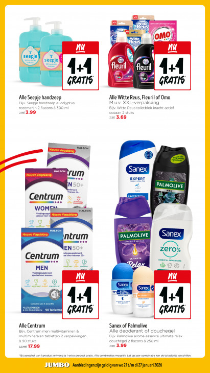 Deze tekst wordt automatisch gegenereerd, dus deze kan fouten bevatten.El nnn ed KLAAR AC] LU ape N21 eur Vi Reus me EE =S ll seepje se En 100/ natuurlijke handzeep seepje = 109% natuurlijke handzeep ri | fl eur! <= CON VAE LACK WASM LLC ) renew Ne RATIS RATIG Alle Seepje handzeep Alle Witte Reus, Fleuril of Omo Bijv. Seepje handzeep eucalyptus M.u.v. XXL-verpakking rozemarijn 2 flacons à 500 ml Bijv. Witte Reus toiletblok kracht actief 298 3.99 oceaan 2 stuks 138 3.69 u HALZON | rum SKIN HEALTH Me: IN FR pplement COMPLEX PALMOLIVE ‘rouwen 504 a Lou as Centrum eee S DE HORMOON oren HUISHOUDING“ | jl) WOM Voedingssuppll speciaal voor vil Pr __| » VU f ENERGIE" WEERSTAND? DENN ntrum | PALMOLIVE eee Aroma Essence D. = > 4 IEN EA zero’ edingssupplement aal voor mannen 50+ Centrum ULTIMATE eee U © % ESSENTIAL INGREDIENTS WEERSTAND? OGEN: GEHEUGENS I MEN ® Lo 5 T 5 Voedingssupplement speciaal voor mannen UT] nu ENERGIE! WEERSTAND? SPIEREN? CONCENTRATIE! 2 2.28% Sanex f MU Sanex 72" see CONTROL DERMA CARE + 8 = 72 + SENSITIVE ms Imi trol Compleet van A tot ZINK ith spant & MULTIMINERALEN 90 Tabletten AEN GRATIS GRATIS Alle Centrum Sanex of Palmolive Bijv. Centrum men multivitaminen & Alle deoderant of douchegel multimineralen tabletten 2 verpakkingen Bijv. Palmolive aroma essence ultimate relax a 90 stuks douchegel 2 flacons a 250 ml 5528 17.99 238 3.99 *Bij aanschaf van 1 product ontvang je 1 extra product gratis. Alle combinaties mogelijk. Let op: per combinatie kan de totaalprijs verschillen. JUMBO