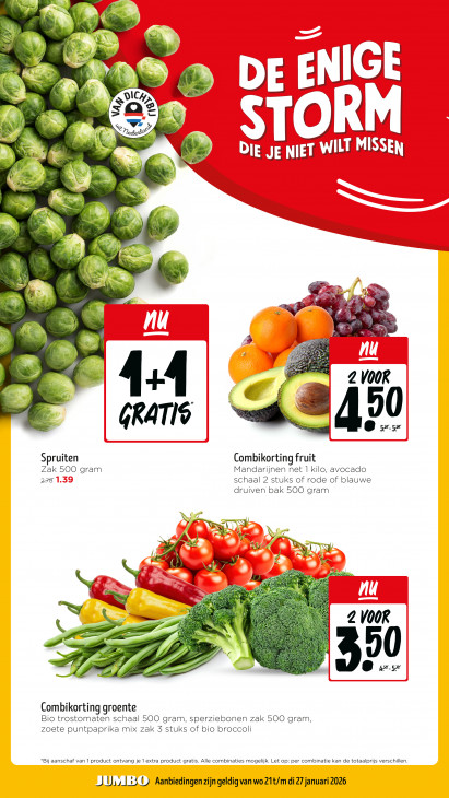 Deze tekst wordt automatisch gegenereerd, dus deze kan fouten bevatten.VA N LU = | 1 ES JE D Le, = aa er RS ei Le IGE a. DE | à L mn 54 ul min à ST DIE JE WILT MISSEN y ed Ey a u Rn JES en jn he hal ; = ET pn EN Pa £ st ke 3 hal - > 2 50 4:4 € % GRATIS cime en 50 Spruiten Combikorting fruit Zak 5OO gram Mandarijnen net 1 kilo, avocado 278 schaal 2 stuks of rode of blauwe druiven bak 500 gram A N BE TH Lie DV BET rin! Ve we Ue 4 À u 2 VOOR Lau A A v0 ® > Combikorting groente Bio trostomaten schaal 500 gram, sperziebonen zak 500 gram zoete puntpaprika mix zak 3 stuks of bio broccoli Bij aanschaf van 1 product ontvang je 1 extra product gratis. Alle combinaties mogelijk. Let op: per combinatie kan de totaalprijs verschillen J Uy) 15 U Aanbiedingen zijn geldig van wo 21t/m di 27 januari 2026