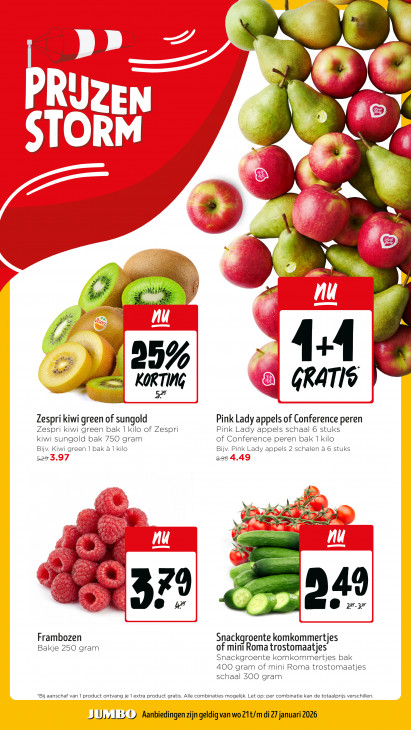 Deze tekst wordt automatisch gegenereerd, dus deze kan fouten bevatten.DN LL PN N 1 4 NN a vv LE 4 | A R LM ne > À N h 2 “4 Wo IN Zi IK 2 wir en 23% Sr KORTING ] GRATI9 Zespri kiwi green of sungold Pink Lady appels of Conference peren Zespri kiwi green bak 1 kilo of Zespri Pink Lady appels schaal 6 stuks kiwi sungold bak 750 gram of Conference peren bak 1 kilo Bijv. Kiwi green 1 bak à 1 kilo Bijv. Pink Lady appels 2 schalen à 6 stuks 529 8-98 > VA Re 4E #9 49 8 - Ks ® Frambozen Snackgroente komkommertjes Bakje 250 gram of mini Roma trostomaatjes Snackgroente komkommertjes bak 400 gram of mini Roma trostomaatjes schaal 500 gram *Bij aanschaf van 1 product ontvang je 1 extra product gratis. Alle combinaties mogelijk. Let op: per combinatie kan de totaalprijs verschillen. J Uy) 15 U Aanbiedingen zijn geldig van wo 21t/m di 27 januari 2026