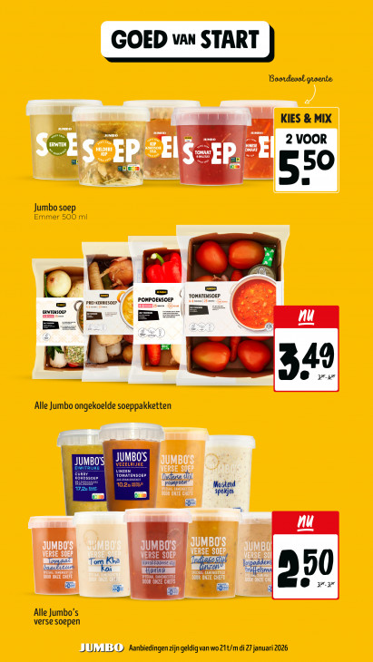 Deze tekst wordt automatisch gegenereerd, dus deze kan fouten bevatten.Boordevol groente » by © où #. “ee JUMBO RC AZIATISCHE un mn D KR FR » Jumbo soep Emmer 500 ml DEE | —— En | EN JUMBO JUMBO E_ = (7 | | | k | had SE EN Alle Jumbo ongekoelde soeppakketten ME VEZELRIJKE VERSE S j 10,26 SPECIAAL SAMENGESTELD Oem Lt QE CHEFS 2 cs A Id, | u 1 x TELD I NZ ze Er Alle Jumbo’s verse Soepen JU;}15 D Aanbiedingen zijn geldig van wo 21t/m di 27 januari 2026