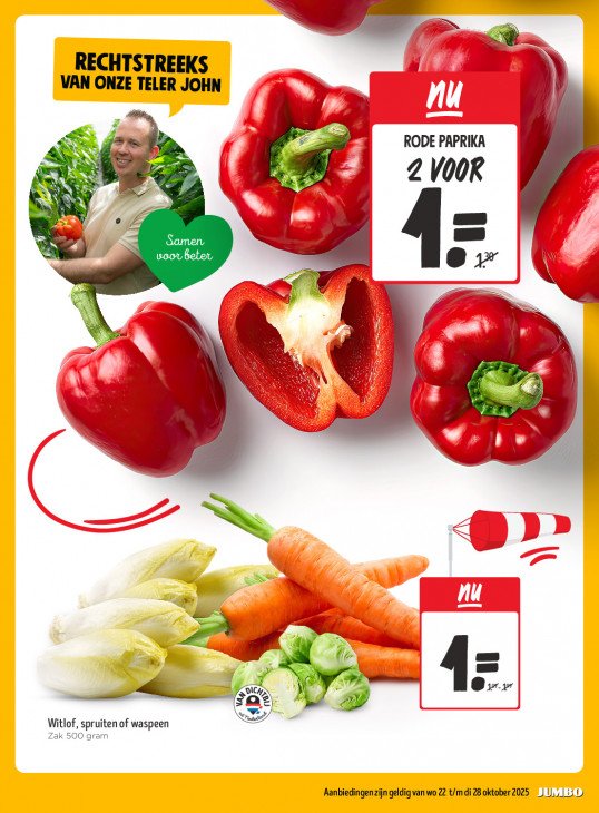 Deze tekst wordt automatisch gegenereerd, dus deze kan fouten bevatten.DP ne à RECHTSTREEKS VAN ONZE TELER JOHN ‘À RODE PAPRIKA D 2 VOOR Samen a voor Beter > RG A D D sf + SNS u TEN Ce S Witlof, spruiten of waspeen Zak 500 gram Aanbiedingen zijn geldig van wo 22 t/mdi 28oktober2025 _JU,, 115 0