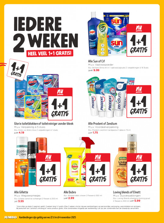 Deze tekst wordt automatisch gegenereerd, dus deze kan fouten bevatten.nm | IEDERE © LI Sun Ps pen ed 4:4 RE GRATIS © WEKEN Alle Sun of Cif M.uw. Vaatwaspoeder Bijv. Brillant Shine All in 1 vaatwascapsules 2 verpakkingen à 16 Stuks 1928 9. rm À HE x( NIEUW! SCE SR) { FRESH | SEL. nu nu siletreini; Id Ocean D 5 5) di eel 4:4 | & ; 144 GRATIS can GRATIS Glorix toiletblokken of toiletreiniger zonder bleek Alle Prodent of Zendium M.uw. Verpakking à 5 stuks M.uw. Voordeelverpakking Bijv. Glorix we blok cítrus 2 verpakkingen à 1 stuks Bijv. Prodent coolmint tandpasta 2 tubes à 75 ml 2384.19 3501.75 8 = SU Satin Care Ram LI U gr LI = Loving moe [2 a Dubro dl A one 4:4 414 414 ad 5 am» — GRATIS GRATIS GRATIS Alle Gillette Alle Dubro Loving blends of Elnett M.uw. Wegwerpmesjes Bi asmiddel citroen 2 flessen 50 ml M.uv. Duoverpakkingen Bijv. Gillette sensitiv ergel 2 flessen à 200 mi ser 99 Bij lends shampoo honing goud ze 3.55 an en à 300 mi 298 5 “Voor alles op deze 2 pagina's geldt: 2 weken lang 1+1 gratis. Eike 2 weken vind je nieuwe aanbiedingen op persoonlijke verzorging, wasmiddelen en reinigers. Bij aanschaf van 1 product ontvang je 1 extra product gratis. Alle combinaties mogelijk per aanbieding. Let op: per combinatie kan de totaalprijs verschillen JUL U Aanbiedingen zijn geldig van wo 22 t/m di4 november 2025