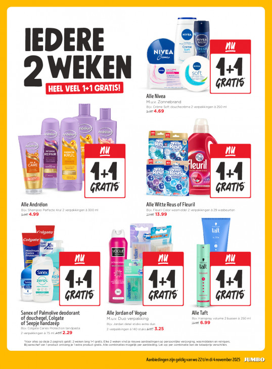 Deze tekst wordt automatisch gegenereerd, dus deze kan fouten bevatten.°s IEDERE LI N 1 soft Ne 4:4 2 WEKEN —— GRATIS Alle Nivea M.uw. Zonnebrand Bijv. Crème Soft douchecrème 2 verpakkingen à 250 mi u 2374, a on) I =) ine: REPAIR LUI 8, l or CARE Ce sd [auf ps Eee 4:4 4:4 Er GRATIS GRATIS Alle Andrelon Alle Witte Reus of Fleuril Bijv. Shampoo Perfecte Krul 2 verpakkingen à 300 ml Bijv. Fleuril Color wasmiddel 2 verpakkingen à 29 wasbeurten ses 4.9 2228 13.99 sten eu taft De (er iple 5 rs aximuri] CS UT LL] LUI ef Aug r Ed wel zero} 4:4 4:4 4:4 GRATIS GRATIS GRATIS 17 Sanex of Palmolive deodorant Alle Jordan of Vogue Alle Taft of douchegel, Colgate M.uw. Duo verpakking Bijv. Hairspray /olume 2 bussen & 250 ml of Seepje handz« Bij Jordan detal sticks extra dun 1388 6. Bijv. Colgate Caries tion tandpasta 2 verpakkingen à140 stuks 650 3.25 2 verpakkingen à 5 m458 2. 29 ‘Voor alles op deze 2 pagina's geldt: 2 weken lang 1+1 gratis. Eike 2 weken vind je nieuwe aanbiedingen op persoonlijke verzorging, wasmiddelen en reinigers. Bij aanschaf van 1 product ontvang je 1 extra product gratis. Alle combinaties mogelijk per aanbieding. Let op: per combinatie kan de totaalprijs verschillen Aanbiedingen zijn geldig vanwo 22t/mdi 4november2025 _)1),,1i5 0)