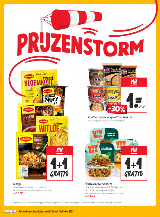 Deze tekst wordt automatisch gegenereerd, dus deze kan fouten bevatten.PRIJZEN STORM Gas Open re LUI groet ne et ASD a uud) HT pa) MAGIC ASIA ei 1 SAUCY ong , he j 6: -30% + 00€ Yum Yum noodles cups of Yum Yum Thai df. Ovens Alle verpakkingen à 70-100 gram am WIT Lb viv GEHAKT STIR-FRY LINES x he AR viv viv UD] ERA LUI 8 414 414 EN is GRATIS GRATIS Maggi Vivera vleesvervangers Alle maaltijdmixen of noedels Alle verpakkingen à 150-216 gram 3581.79 Bijv. Kruidenmix ovenschotel bloemkool room Mu. Grootverpakkingen 555 3. Bijv. Kruimgehakt 2 verpakkingen à 200 gram “Bij aanschaf van 1 product ontvang je extra product gratis Alle combinaties mogelijk. Let op: per combinatie kan de totaalprijs verschilen. JUL U Aanbiedingen zijn geldig van wo 22 t/m di 28 oktober 2025