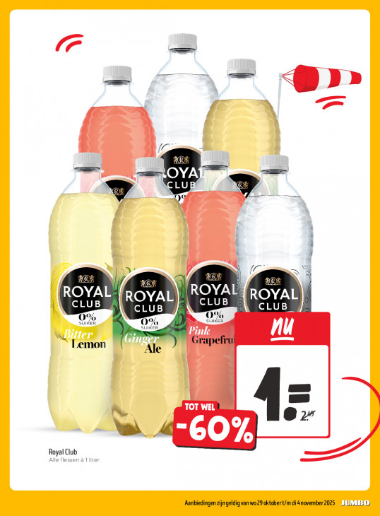 Deze tekst wordt automatisch gegenereerd, dus deze kan fouten bevatten.F +. = Vos Te (Z CL u > We IV FACH LC ii EC (ROYAL! ROYAL (ROYAL CLUB ROYAL CLUB CLUB CLUB SUIKER % SUIKER, Pink nu à Lemon Ale TOT WEL 62: ‘ns. 60% Royal Club Alle flessen à 1 liter ‚Aanbiedingen zijngeldig van wo 29 oktobert/mdi4november 2025 ) 13 U