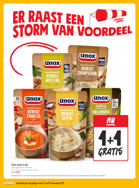 Deze tekst wordt automatisch gegenereerd, dus deze kan fouten bevatten.BRON # Ex Unox), DATA ES mu) SMAAK ROMIG CHAMPIGNON — SOEP — CRE 3 w 4 Unox ms me 4 LU aan CUT] LITE] #2 UNSS LT x Ae 44 | à GRATIS Unox soep in zak Alle zakken à 570 ml Bijv. Hollandse erwtensoep 2 zakken sr “Bij aanschaf van 1 product ontvang je extra product gratis. Alle combinaties mogelij. Let op: per combinatie kan de totaalprijs verschilen. JUL U Aanbiedingen zijn geldig van wo 5 t/m di 11 november 2025