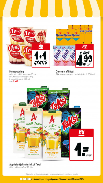 Deze tekst wordt automatisch gegenereerd, dus deze kan fouten bevatten.T pe TT ll 1 — |T Te mel Chocomel Ed se tente De enige ECHTE erf or un Corel VANILLESMAAK nous pudding mel rdbei GRIESMEEL re TR « A 8 nu CALCIUM we ä CALCIUM ll U 0e = QE 72 % f IS KW GRIESMEEL S 8 m 2 VOOR Pudding met HERF 44 Sa 99 Gee GOEDEN Rss GRATIS 8 7 Chocomel of Fristi Mona puddin Alle verpakkingen à 450 ml Alle verpakkingen met 6 stuks à 200 ml Bijv. Mona Griesmeelpudding 2 verpakkingen a 450 ml 496 2.49 Geen suiker toegevoegd Geen suiker toegevoegd 6) am Kö Æ = 6) AN lj < gvuit D met eer 6) vleugje zu: Pp x gvuit Dri n 2 met een gruit Drin k met een 93 vleugje zuivel 5 +. vleugje zuivel A wl Bn. UP] = h E_ pe 2 Se = rn = ro —2 40% minder s = mn JI ED 40% minder suiker pr Appelsientje Fruitdrink of Taksi Alle pakken a 1 of 1,5 liter Bij aanschaf van 1 product ontvang je 1 extra product gratis. Alle combinaties mogelijk J Ui | #5 ID Aanbiedingen zijn geldig van wo 28 januari t/m di 3 februari 2026