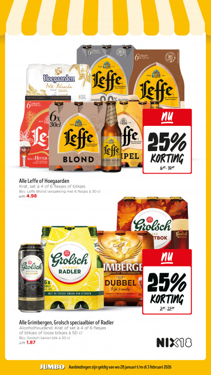 Deze tekst wordt automatisch gegenereerd, dus deze kan fouten bevatten.13 Ale. 0,0% Vol. 30cl 6 x33cl N 6 Alc. 0,0% Vol. ANNO u 1240 F He 1240 Hoegaardent € Wi Bla nche Biere Belge dAbbaue PA! SD Cm el e :DITION SAISO El DITIE Ale, 4,9 33cle Vol. Belgisch Abdijbier ière Belge d'Abbaye ONDE o B ON | Alc. 6,6% Vol. x33cle ve) N 2 KE: Ei ANNO À ne + nu art = ° Hl 0 N YA € I € Dürer Dehar dinge Derse Belge d Abla LUTTE ES = à en 129% effe d'ép BL G PEL KOR RTING a Î ne Alle Leffe of Hoegaarden Krat, set à 4 of 6 flesjes of blikjes Bijv. Leffe Blond verpakking met 6 flesjes à 50 cl 665 4.98 ARE SCAN 2 (FF df ch UP; IS ar TBOK BO 0, LATE 8 CA NS Z GiB N / 4 mn Al] Giolsch Gelk KRACHTIG RADLER PDT JEONDEE EN - ABDIJ OPGERICHT 1: 4 De _ +]128+ 6x 30cl DUB ALC. 2,0% Ci ALIEN EETL LL RARA EZ, 225% KAKCHTIG EN VOL VAN KORTING JAN MAA == Alle Grimbergen, Grolsch speciaalbier of Radler Alcoholhoudend. Krat of set à 4 of 6 flesjes of blikjes of losse blikjes à 5O cl Bijv. Grolsch kanon blik à 50 cl 279 1.87 NIC _J U;715 D Aanbiedingen zijn geldig van wo 28 januari t/m di 3 februari 2026