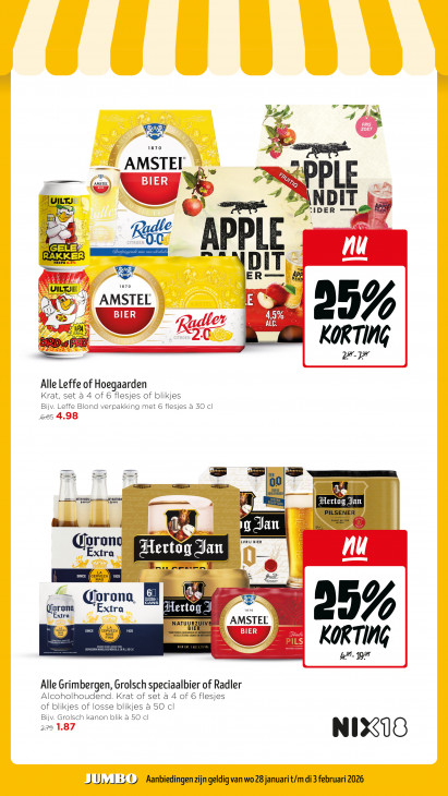 Deze tekst wordt automatisch gegenereerd, dus deze kan fouten bevatten.B Tr À R = À "& 1870 x = AMSTEI NES aD SPPLE .. { VE DL À NS NDIT UILTJ ë IDER HA N ur IS c D? sf APPLE ll RAKKER NEIPA 6.5% RAR, DIT, RN ER 1870 LTJE LL AMSTEL © 9 AL 4 % 23% udler R 20 ww KOR RTING Alle Leffe of Hoegaarden Krat, set à 4 of 6 flesjes of blikjes Bijv. Leffe Blond verpakking met 6 flesjes à 50 cl 665 4.98 EEN SD ER 0 BIERLIEFHEBBER VOR DE I | ER, ATH 100% Lac NATURA ettog Jan Mams 121 dé ZE Era MOREL 2 grong LVRIJ BIER xtra En CA D QUE AU nu _ in ETE — de Ee _— DFOND, 6. emmen RAA Extra 870 (orana Extra 5 ae, 23% NATUURZ AMSTEL SINCE 1925 ESELECTEERDE GRANEN: (EEL GEBROUWEN UIT Jradi = CERVECERIA M BIER CAT. 1 A Diet KORTING Alle Grimbergen, Grolsch speciaalbier of Radler Alcoholhoudend. Krat of set à 4 of 6 flesjes of blikjes of losse blikjes à 5O cl Bijv. Grolsch kanon blik a 50 cl 279 1.87 NIRO J Ui | #5 ID Aanbiedingen zijn geldig van wo 28 januari t/m di 3 februari 2026