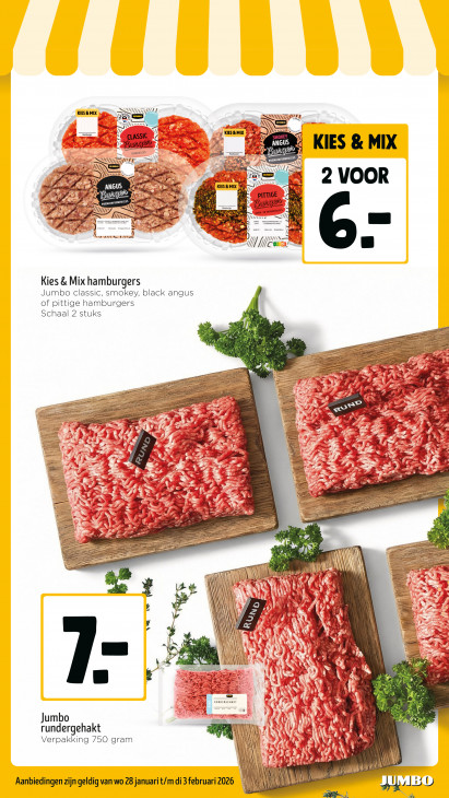 Deze tekst wordt automatisch gegenereerd, dus deze kan fouten bevatten.Dn _ KIES&MIX 2 a ds 1 N SU en dr gs lij Hamburger ssh Ag # KIES & MIX D 0 fe. CUS”: D SU eef Mein ‘2 ES) / Wd NN KIES & MIX RUNDVLEES I + a B 5 UIN Mi br guno- EN VAAK ENSVLEES ss Ur a” Ya [1/8 mn h au L. BUIS HIT = We + u Kies & Mix hamburgers Jumbo classic, smokey, black angus of pittige hamburgers Schaal 2 stuks A m er zer ee AS ed < À 1, ns r fa AB gert = & Gd A : Let + II = RD er ” à >» 7? x A es Las US € A 4 Ai DJ Se > LT TR, 7 L & 9 5, & PS rn ar % dd x LU >, À x DD 4 2 ES 3. “ LA À @ ne 28 VE 3 = Dn 3 Bip, 5 7 I - ASE +” LC x u er PS > s > SM 1 > Ie 3 X NS & 2 2 5 à Ze A Cn = = AN MN I B A \ ‚$ é x he. K | u \ à u. fi 4 } FE { &: Be À NIN FA \ N v \ E N Na N N | MN F 4 Es uf t ù CE À LR 2 £ < À ) ‘ { fi il A „3 à Bf >. ; % ba a IE: U À PA PE Se Ÿ 8 \ ETS PE à A RUNDERGEHAKT > À à À À À 3 de Jumbo rg AD La à SA Er UN 18. ij t rundergehakt Ex \% Wat y < 22 À Verpakking 750 gram | N y u ER 7 JA v L \ ‚a \ "UE \\ AN PJ Aanbiedingen zijn geldig van wo 28 januari t/m di 3 februari 2026 MD) D DE. Sn