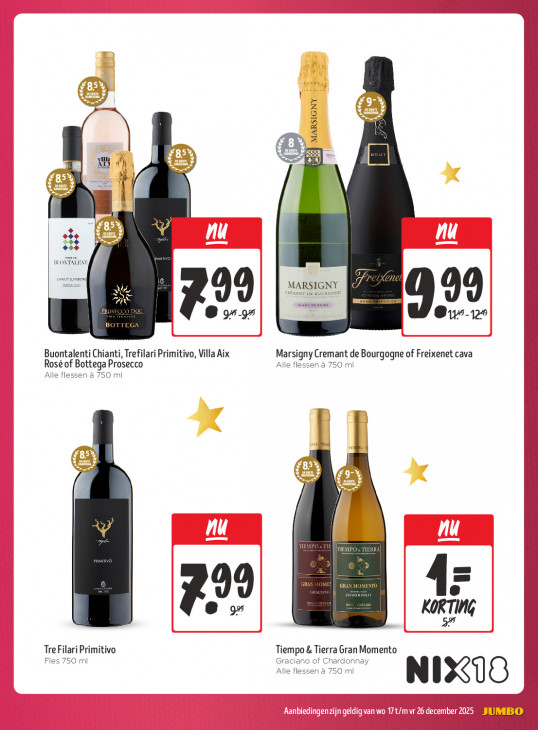 Deze tekst wordt automatisch gegenereerd, dus deze kan fouten bevatten.5 5 ville NE 6 sà | 4 #3 ++ LOVEN G Ak RTE MARSIGNY be Fe = 3 99 BOTTEGA Buontalenti Chianti, Trefilari Primitivo, Villa Aix Marsigny Cremant de Bourgogne of Freixenet cava Alle flessen à 750 ml Alle flessen à 750 ml Rose of Bottega Prosecco AB Ê mr Fr | EN A 99 ® 9 KORTING Tre Filari Primitivo Tiempo & Tierra Gran Momento Fles 750 ml Graciano of Chardonnay Alle flessen à 750 ml 100 JUMBO