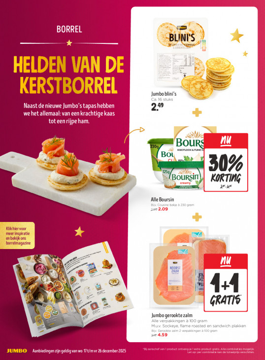 Deze tekst wordt automatisch gegenereerd, dus deze kan fouten bevatten.a BORREL * BUN 5 je Au HELDEN VAN DE NE, > KERSTBORREL Jumbo blini’s Ca. 16 stuks NS Naast de nieuwe Jumbo's tapas hebben 2.” we het allemaal: van een krachtige kaas tot eenrijpeham. Ve = BOURS KNOFLOOK RFUNE RÉ Bot | 5, 5 nd 50% Wi ae ® u KORTING Alle Boursin Bijv. Cousine bakje à 230 gram 228 Klikhier voor meer inspiratie ENÁ enbekijkons »7 borrelmagazine EA os Or Us 2 fs a m ar ’ Zen lof 73 Ge & 8 LE 414 @ à Z | GRATIS = . Jumbo gerookte zalm > DE Alle verpakkingen à 100 gram Muv. Sockeye, flame roasted en sandwich plakken Bijv. Gerookte zalm 2 verpakkingen à 100 gram JUMBO _ Aanbiedingen zijn geldigvan wo 17t/m vr 26 december 2025