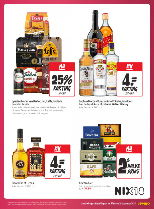 Deze tekst wordt automatisch gegenereerd, dus deze kan fouten bevatten.(te fee ET ae 1732 ss Ü 20 LL Jan Ri un GRAND TIC Je [> N ij 5e voore Grolsch, 4 HERFSTBOK 1 27 ER) KORTING EE KORTING YA 157-107 _— Speciaalbieren van Hertog Jan, Leffe, Grolsch, Captain Morgan Rum, Smirnoff Vodka, Gordon's Brand of Texels Gin, Baileys Likeur of Johnnie Walker Whisky Alcoholhoudend Krat, set à 4 of 6 flesjes of blikjes Alle flessen à 700 ml of losse flesjes of blikjes M.uv. Radler, gekoelde bieren en geschenkverpakkingen / EN Jupiler f le DNA ID Zi QI CEV] ALFA A Ai HALVE KORTING Be | Da PRINS PRET | Disaronno of Licor 43 Kratten bier Alle flessen à 700 ml Bijv. Hertog Jan 2 kratten à 24 x 330 mi 4287 NIVO JUMBO