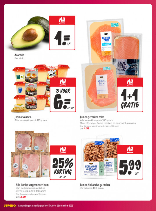 Deze tekst wordt automatisch gegenereerd, dus deze kan fouten bevatten.Be EA = our Va ine F Avocado Per stuk à M — A El) € V3 ger Viart 3 VO A ) Dn = Ee 4:4 a 8 kip-samba GRATIS pn Johma salades Jumbo gerookte zalm Alle verpakkingen à 175 gram Alle verpakkingen à 100 gram Muv. Sockeye, flame roasted en sandwich plakken Bijv. Gerookte zalm 2 verpakkingen à 100 gram ee EEN | In = > & hr A Vi k a vi Tj ho) ANDSE Pan 27 HOLLANDS] NALEN AT A GARNALEN 99 —æ on — =) de: | KORTING un 6 ; Ë CE mn | ae Alle Jumbo vergesneden ham Jumbo Hollandse garnalen Van de bedieningsafdeling Verpakking 100 gram Verpakking à 100-120 gram Bijv. Slagersachterham per 100 gram 205 JUMBO Aanbiedingen zijn geldig van wo 17 t/m