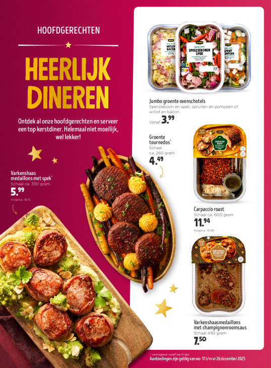 Deze tekst wordt automatisch gegenereerd, dus deze kan fouten bevatten.HOOFDGERECHTEN ex € Ge fl # ON san » ! SPERZIEBONEN SPEK Ge VES pon De & LUN 3 en Jumbo groente ovenschotels ek sprui ET AE 47228 3% eentop kerstdiner. Helemaalniet moeilijk, TETE) Groente tournedos’ ) gram 4 I Varkenshaas medaillonsmet spek” Klene oeh} Er \ 5 2) I en à Kilopris: 1815 Car accio roast EN 5 94 à ( À } FE = en, À re a Nd pe A; KS hd * = =d Varkenshaasmedaillons gn met champi am à CALE) 2 75° + |, NT LIT Aanbiedingen zijn geldig vanwo 17 t/m vr 26 december 2025