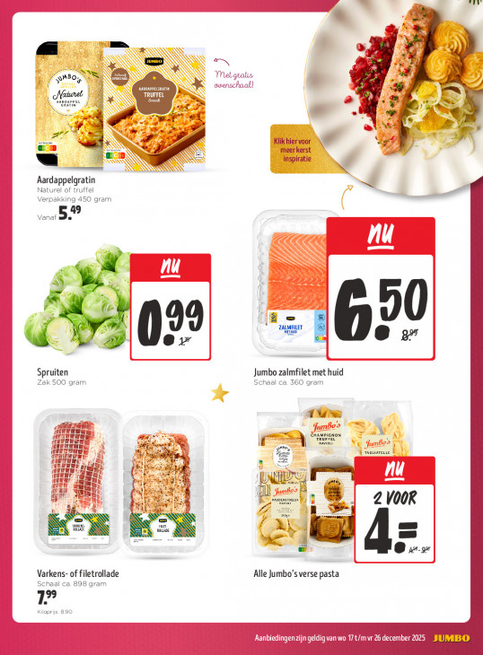 Deze tekst wordt automatisch gegenereerd, dus deze kan fouten bevatten.BE = AT B ON IS Met valis SE 7 PEEN NS aal) au TRUFFEL À 1 N Se = ele 2 24 ps < + + Ds f 2 > rn # Klik hier voor .“ y meer kerst inspiratie Aardappelgratin Naturel of truffel Verpakking 450 gram vara De Br N > le = 99 ZALMEILET MD Pu er 62 —— —— Spruiten Jumbo zalmfilet met huid Zak 500 gram Schaal ca. 360 gram TVR in Ehameienon W FE À Aaa Rat ar zn Taautarcuie ® ww Sy EC Ru / [DA \ D er Rx 3 ) ñ F h D ten = 2 VOOR | A Sy N mm Fe SS & F A a ns : = - u de Varkens- of filetrollade Alle Jumbo’s verse pasta Schaal ca. 898 gram 1 Kiloprijs: 8.90 En 5 205 JUMBO 4 4