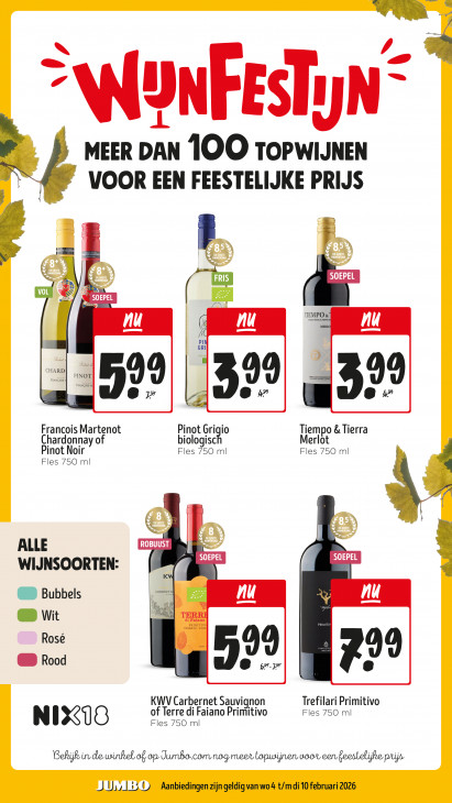 Deze tekst wordt automatisch gegenereerd, dus deze kan fouten bevatten.Ee NYNEESTyN . MEER DAN 100 TOPWIJNEN VOOR EEN FEESTELIJKE PRIJS ge À = SOEPEL B LIU & SOEPEL nu | ul LM ul GR CHARD ro er ones A PA | BR 99 5 = ® + 32° Francois Martenot Pinot Grigio Tiempo & Tierra erlot Chardonnay of inot Noir biologisc Fles 750 ml Fles 750 ml Fles 750 ml 4 ROBUUST a ALLE SOEPEL WIJNSOORTEN: sDEPEL nu © Bubbels nu @ wit TERR TU Rosé 8 99 EB Rood 8 > KWV Carbernet Sauvignon Trefilari Primitivo NIRO of Terre di Faiano Primitivo Fles 750 ml Fles 750 ml J Uy) 15 D Aanbiedingen zijn geldig vanwo4 t/m di 10 februari 2026