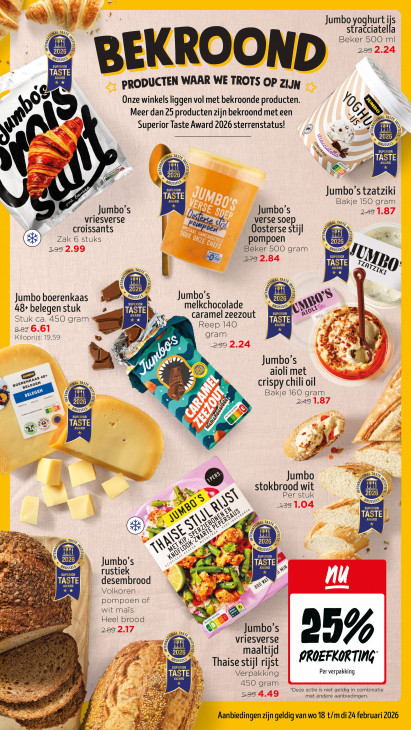 Deze tekst wordt automatisch gegenereerd, dus deze kan fouten bevatten.“> ze Ns . S a, “ é Jumbo yoghurt stracciate l d ee Beker 500 ml ANT ERYy > Un 229 2.24 SRUSSE * SA) EKROON N AWARD Lo. PRODUCTEN WAAR WE TROTS OP zijn Onze winkels liggen vol met bekroonde producten. % Meer dan 25 producten zijn bekroond met een # 7 SS TAs7g Superior Taste Award 2026 sterrenstatus! 1, «x 2° El : 5 ? ) % de, BRUSSEN>, nn, % % SUPERIOR > AWARD { Se A” d * E Da 4 à BRUSSELS A SUPERIOR Jumbo'’s tzatziki IN TASTE AWARD Bakje 150 gram Jumbo’s Jumbo ’s 2491.87 vriesverse verse Soe AA croissants Om, 1 > ©, L Tasyg 4 Oosterse stijl Zak 6 stuks ompoen ANT ERYy * nn 3992.99 Beker 500 gram @ O5, 379 2.84 SUPERIOR I AWARD T9 7 als 4 ey Red Bo NTERYJ, \ ns Se JAsre * SRUSSE * ë Ss va Jumbo boerenkaas $ SA) \ Jumbo's : 5 48+ belegen stuk TASTE melkchocolade BRUSSELS 4 AWARD Lo. caramel zeezout SUPERIOR F Stuk ca. 450 gram Reep 140 AWARD i 887 6.61 ss Kiloprijs: 19,59 Aa gram Là 299 2.24 Nd 4 Jumbo’s € 2 =, & Men aioli met 8 gorf een SE TAsre crispy chili oil Ki vtt = un Bakje 160 gram 249 * * so” SUPERIOR 5 SD ‘€ S &S Sy AWARD % #4 j à L & er sd > > Jumbo A es TASy à Ne stokbrood wit E É Per stu ë © | «> ‘ BRUSSE +39 1.04 LP SUPERIOR _ [B Ne NN WE SP SD, AWARD © ge Tas, 7e KEN ze er ® d : ä SE TAS?e 4 RR N BRUSSE * . NS SUPERIOR in Jumbo’s er RUSSEN” a AWARD RS SUPERIOR rustie AWARD desembrood sr“ ul Do. Volkoren cd Bo pompoen of wit maïs Heel brood 2852.17 2.7 Jumbo’s SE TAsy, vriesverse 29% 1 : maaltijd BRUSSEN>, EU Thaise stijl rijst PROEFKORTING N Verpakking Per verpakking AWARD PR 450 gram *Deze actie is niet geldig in combinatie 5994.49 met andere aanbiedingen. ss \ ral Aanbiedingen zijn geldig van wo 18 t/m di 24 februari 2026 Sr