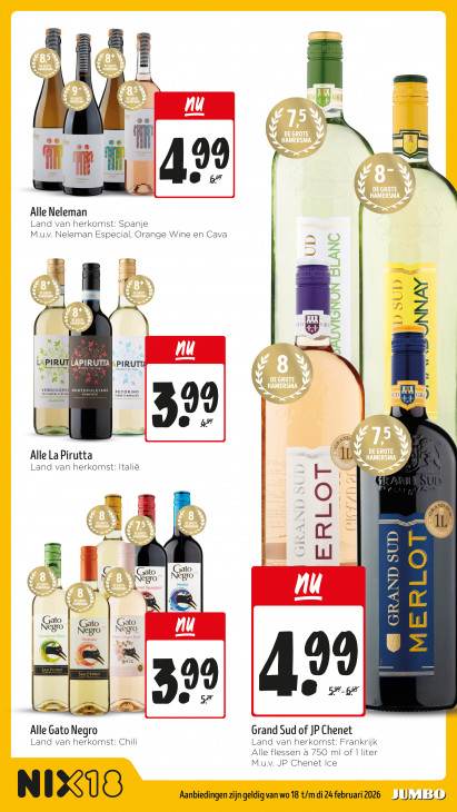 Deze tekst wordt automatisch gegenereerd, dus deze kan fouten bevatten.DN = = == f + | UP] =” 9 @ oo M 99 Alle Neleman Land van herkomst: Spanje M.uv. Neleman Especial, Orange Wine en Cava C € UD < ff u wei ‘Ee = Pa ; ne en ) oUD | GR | © IJNNAY tv 5 nu LAPIRU proouer of tai PRODUCT of ITALY PIRUTT, FAR) “x Ex VER MEANS Pecorıno D'ABRUZZO TERRE D'ABRUZZO = GR eLassico Ye PE 7 Us \ 99 6 ‚- tb Alle La Pirutta u Land van herkomst: Itali& r 3 2 IL ato ato | S e gro net S: egro sauvignon Merlot LOT d A = E ato ato ato egro nu IN 2 gro we xe € GRAND SUD @ Ne TA | ME IN 99 6 ::: A ® Te ZEN Alle Gato Negro Grand Sud of JP Chenet Land van herkomst: Chili Land van herkomst: Frankrijk Alle flessen à 750 ml of 1 liter M.u.v. JP Chenet Ice NIX Aanbiedingen zijn geldig van wo 18 t/m di 24 februari 2026 li, 130)
